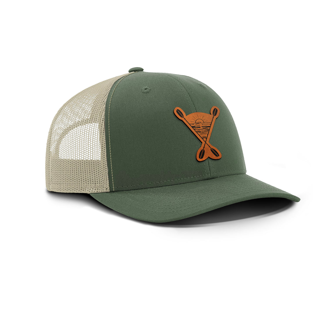 KAYAKING INTO THE SUNSET Snapback Leather Patch Hat - MOSS/KHAKI BLOWOUT